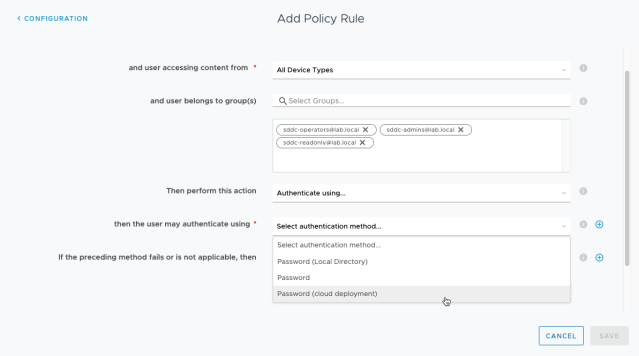 Then the “Add Policy Rule” window will pop up. At this stage, just leave the first two configuration items as default: “ALL RANGES” and “ALL Device Types”. In the “and user belong to group(s)” config item, search and add all 3 synced groups (sddc-admins, sddc-operators and sddc-readonly) to allow the users in these 3 groups to log in.