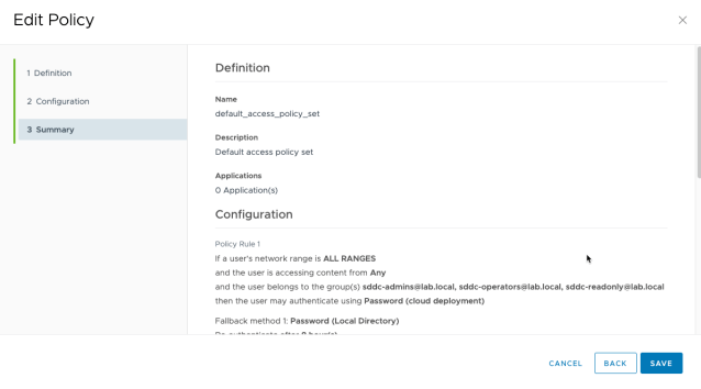 Now it is time to update the access policy to use corporate Active Directory to authenticate VMC users.