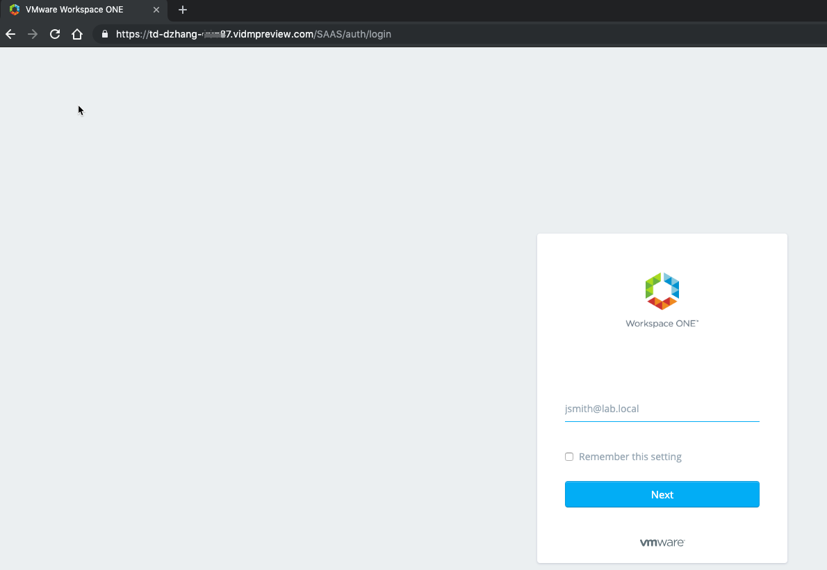 You are now good to test your authentication set up. Open a new Incognito window in your Chrome browser and connect to the vIDM URL. Type in the username (jsmith@lab.local) and click Next.