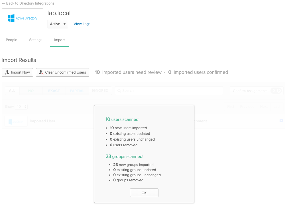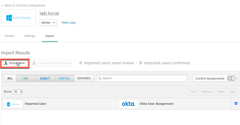 Select the user/users to be imported and confirm the user assignment. Note: the user jsmith@lab.local is imported here, who will be used for the final integration testing.