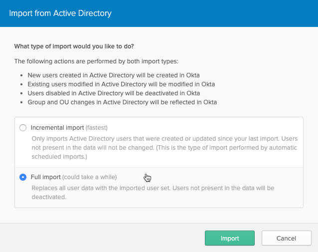 As it is the first time to import user/users from customer AD, select “Full Import” and click Import.