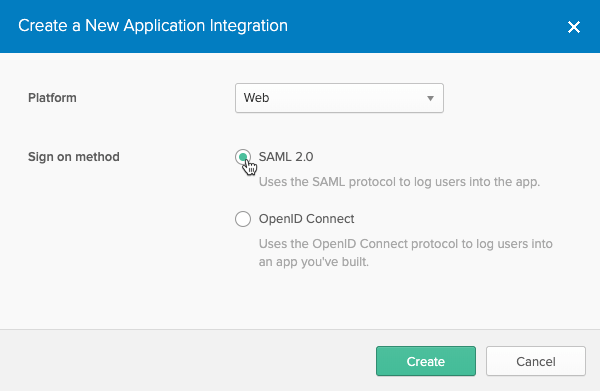 Select Web as the Platform and “SAML 2.0” for Sign on method and click Create;