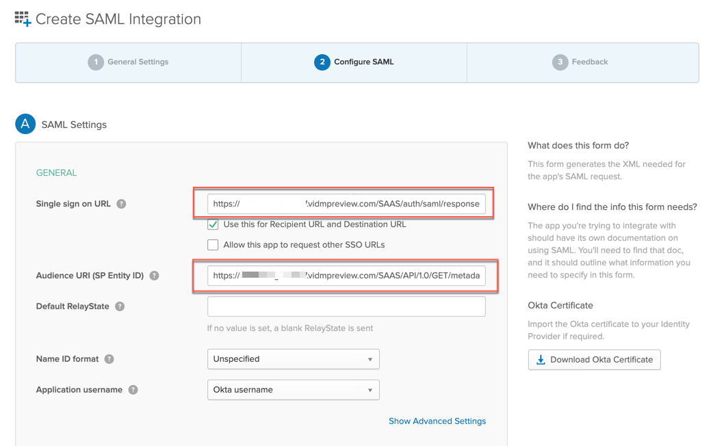 The entity ID and HTTP-POST location are required information for Okta IdP SAML setting. Copy the entity ID URL link into the “Audience URI (SP Entity ID) and HTTP-POST location into “Single sign on URL” in the Okta “Create SAML Integration” window.