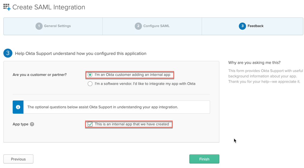 In the Feedback window, suggest the newly created app is an internal app and click Finish.