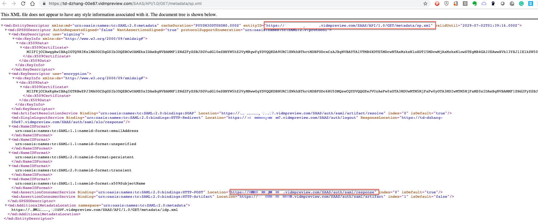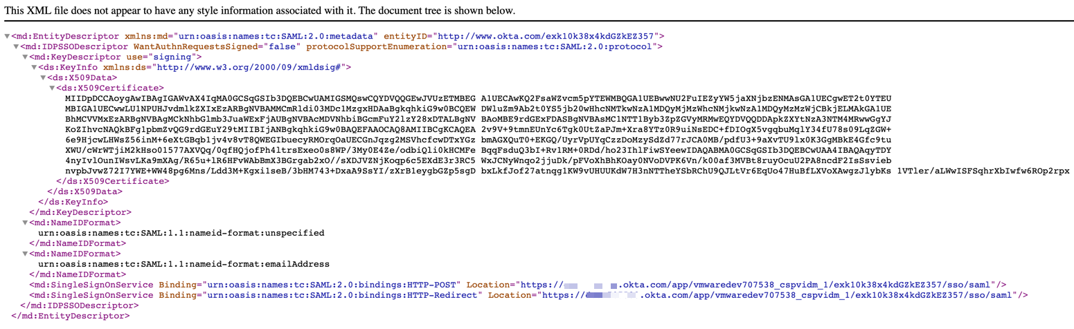 The XML file format of Identity Provider metadata shows up. Select all content of this XML file and copy.
