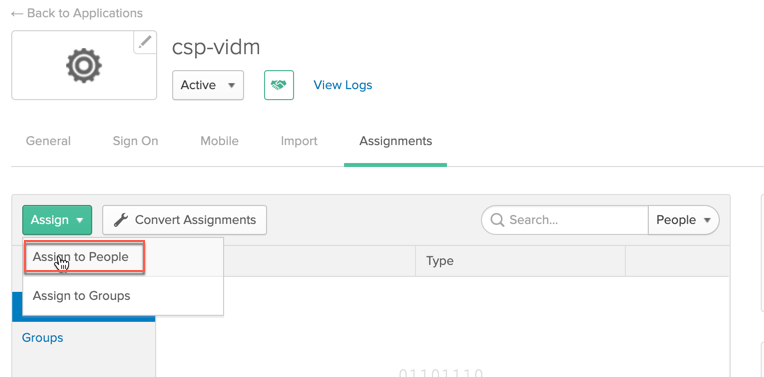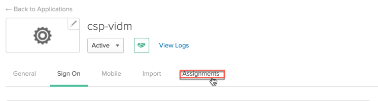 Before going to test the setup, go to Okta UI to assign user/s to the newly defined SAML 2.0 web application “csp-vidm”. Click Assignment.
