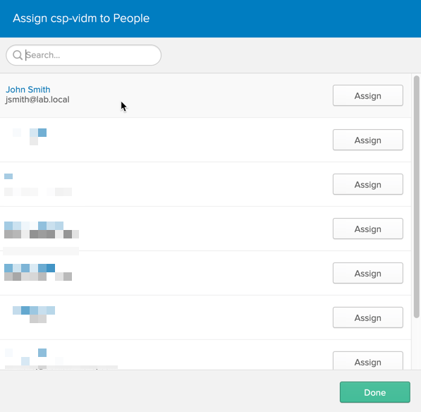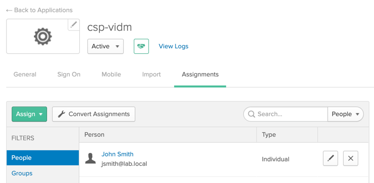 In the “Assign csp-vidm to People” window, assign user John Smith (jsmith@lab.local), which means that the user John Smith is allowed by this SAML 2.0 application.