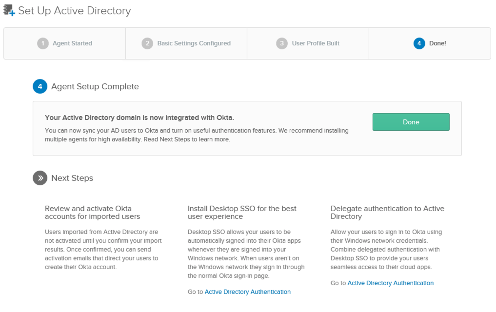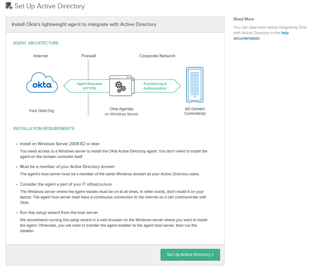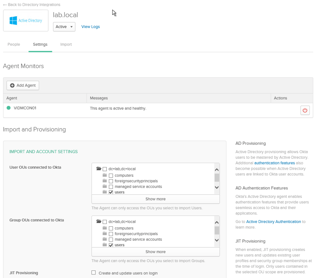To add the same users and user groups in Okta IdP as the configured vIDM tenant, we need to integrate Okta with corporate Active Directory (AD). The integration is via Okta’s lightweight agent.