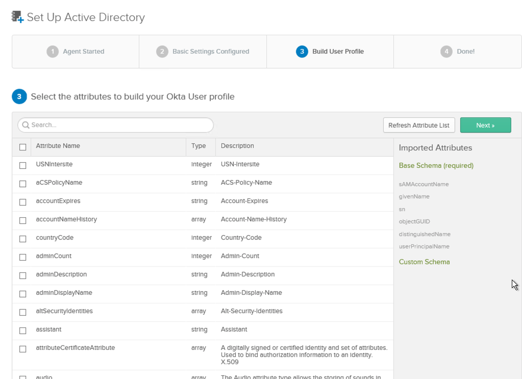 In the “Build User Profile” window, select any custom schema which needs to be included in the Okta user profile and click Next.