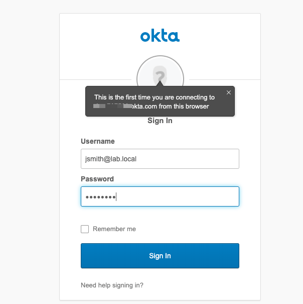 The authentication session is redirected to Okta.