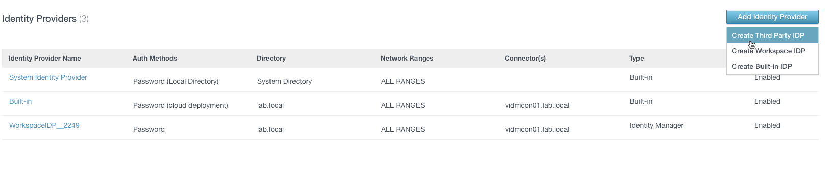 Go to vIDM tenant administrator console and click “Add Identity Provider” and select “Create Third Party IDP” within the “Identity & Access Management” tab.