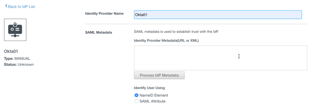 Type in the “Identity Provider Name”, here the example name is “Okta01”