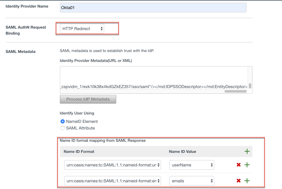 The “SAML AuthN Request Binding” and “Name ID format mapping from SAML Response” will be updated as below:
