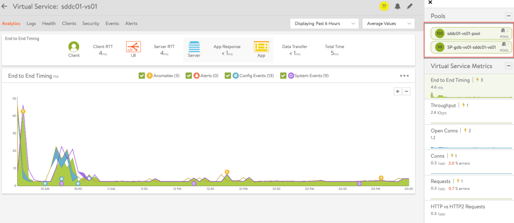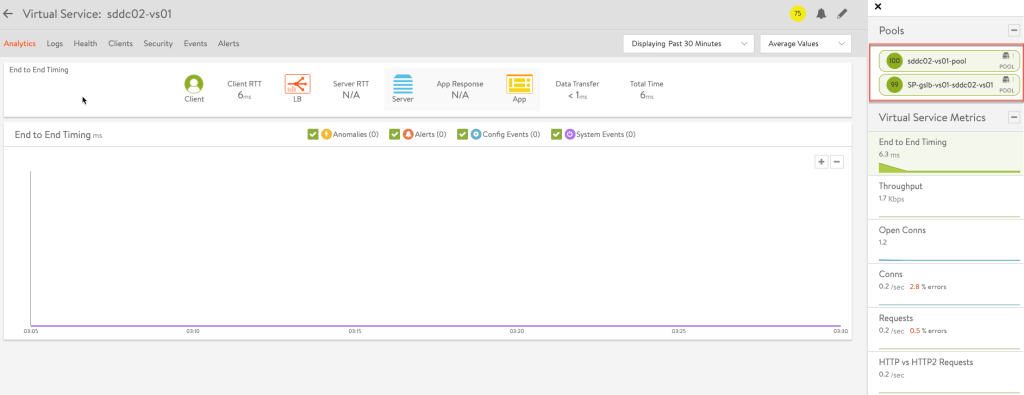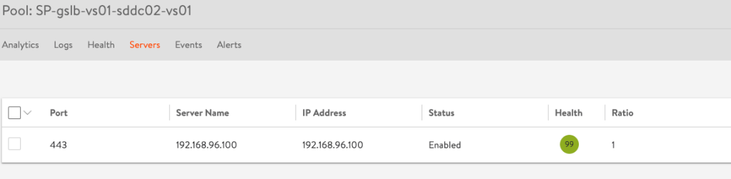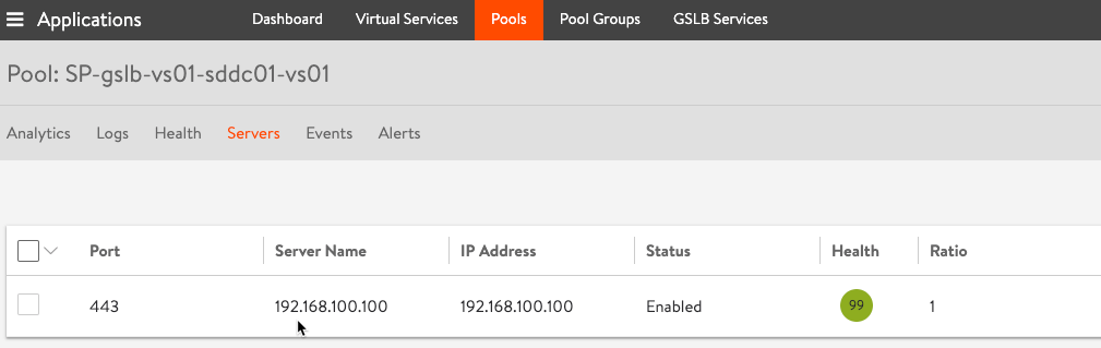 After we have completed the above configuration, a new pool called SP-gslb-vs01-sddc01-vs01 is added into the local load balancing virtual service: sddc-vs01 on SDDC01 Avi LB.