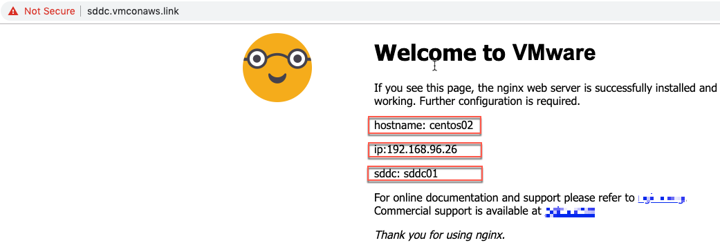 First, the GSLB DNS resolves the DNS name (www.sddc.vmconaws.link) of our testing application to the VIP in SDDC01. When we input the URL https://www.sddc.vmconaws.link into the browser, we are served by centos02 in SDDC01 as expected.