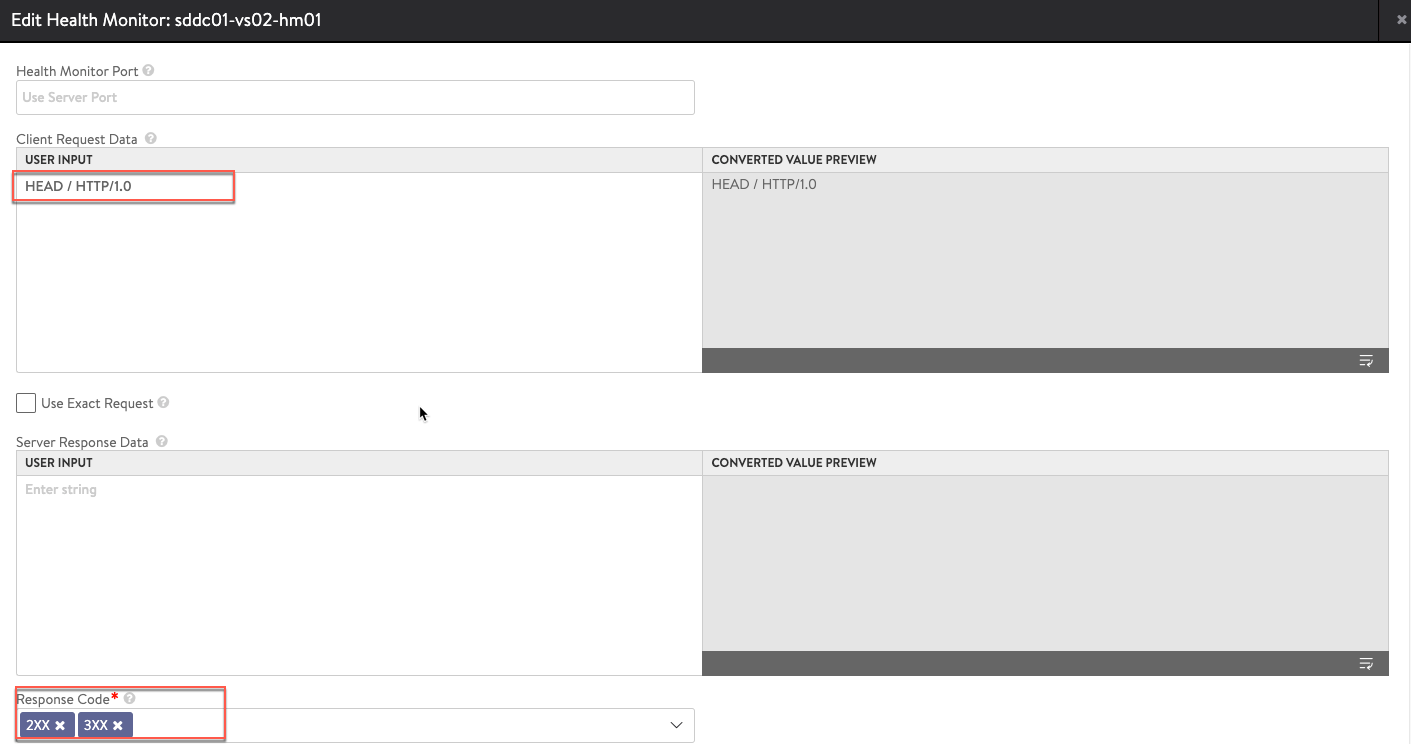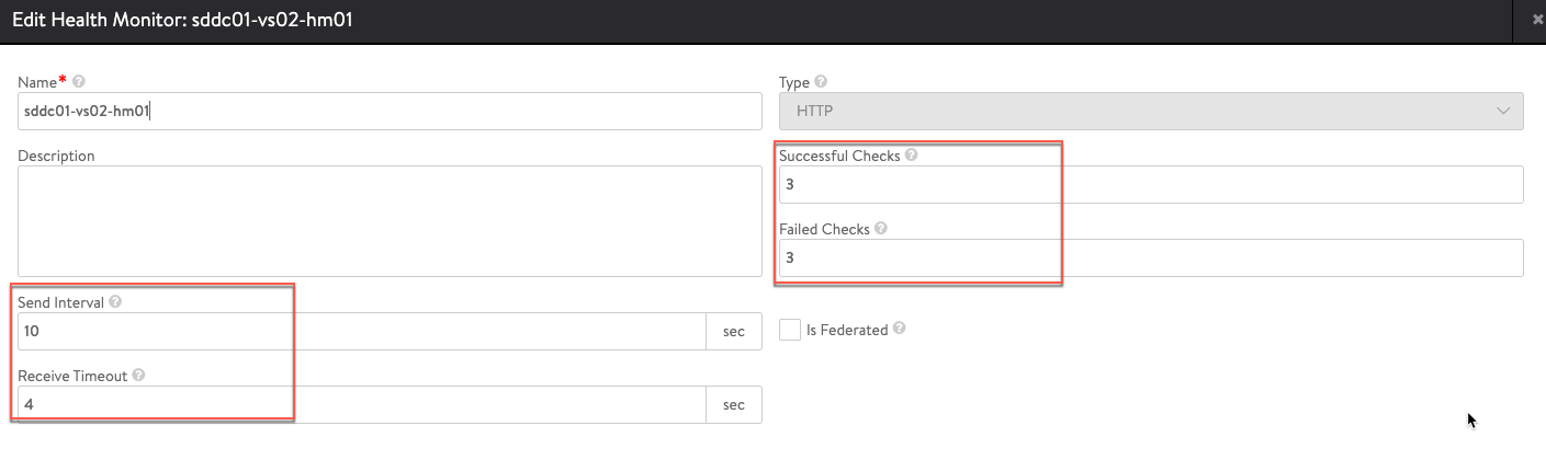- Create an HTTP Health Monitor (sddc01-vs02-hm01).