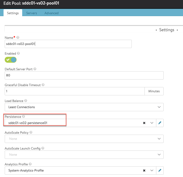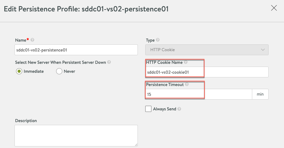 - Create an Application Persistence profile (sddc01-vs02-persistence01) based on HTTP cookie.