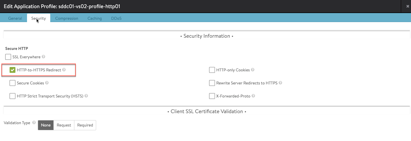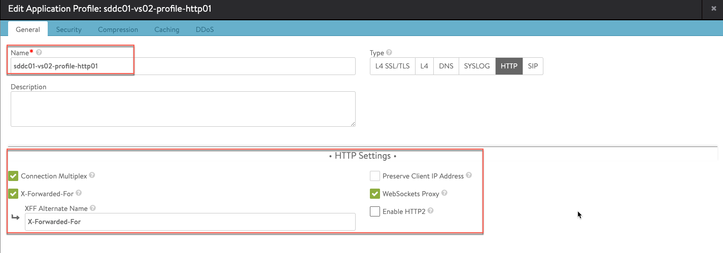 - Create an HTTP application profile (sddc01-vs02-profile-http01) which enables the compression and HTTP to HTTPs redirect.