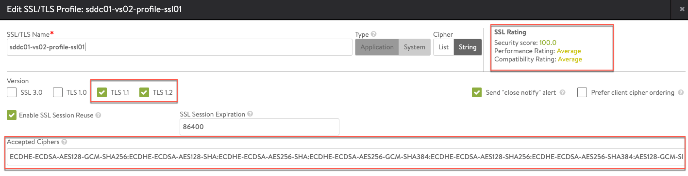 - Create an SSL profile (sddc01-vs02-profile-ssl01) which only allows securer ciphers and TLS 1.1 and 1.2.