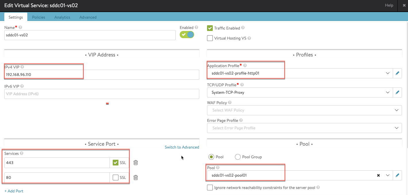 - Create a local load balancing service which leverages the newly created HTTP application profile and SSL profile to distribute the traffic to the load balancing pool sddc01-vs02-pool01.