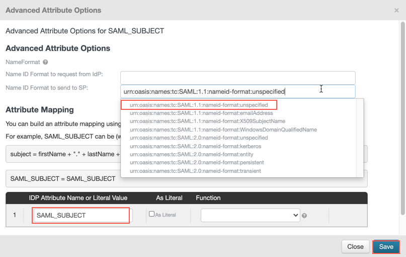 A new window will pop as below. Select “urn:oasis:names:tc:SAML:1.1:nameid-format:unspecified” from the drop down menu of “Name ID Format to send to SP” and input “SAML_SUBJECT” in the “IDP Attribute Name or Literal Value” column then save the configuration.