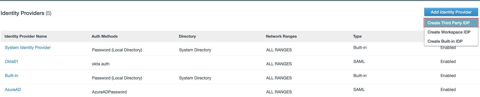 Go to the vIDM tenant administrator console and click “Add Identity Provider” and select “Create Third Party IDP” within the “Identity & Access Management” tab.