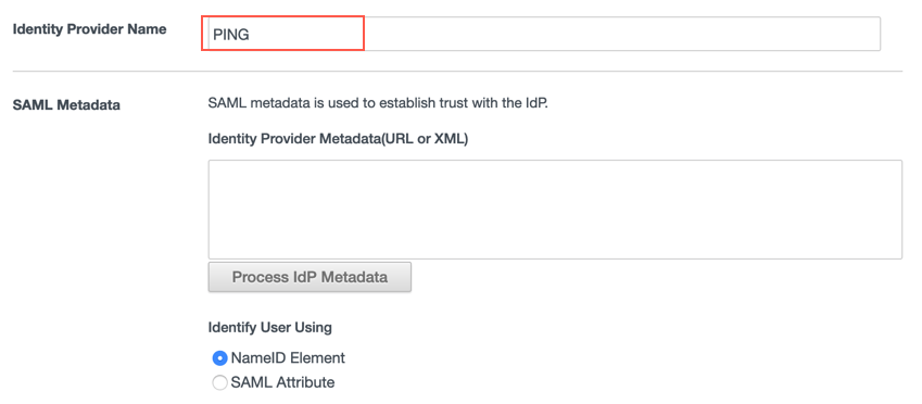 Type in the “Identity Provider Name”, here we use “PING” as the IdP name.